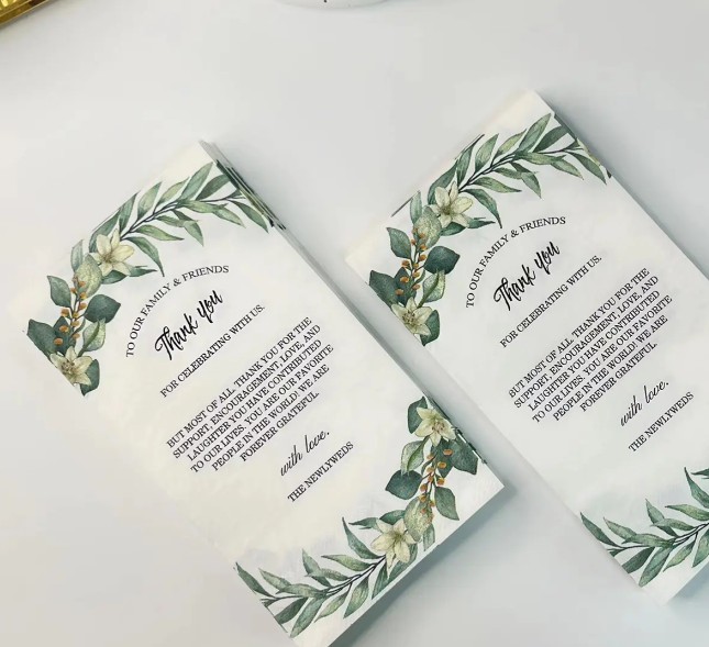 Sama ada pesta ulang tahun, perkahwinan bertema, atau acara penjenamaan korporat, tisu bercetak tersuai dengan sempurna melengkapkan tema dan skema warna acara. Bayangkan satu tetapan meja yang indah, setiap tisu yang dicetak dengan logo pasangan, slogan korporat, atau motif perayaan -perhatian yang bijak terhadap perincian dengan serta -merta menunjukkan komitmen penganjur terhadap kualiti. Ini bukan sahaja menyediakan kemudahan untuk tetamu, tetapi juga mengukuhkan tema acara secara halus.
